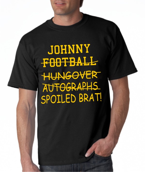 Johnny Football Hungover Autograph Spoiled Brat design on a black shirt $ 18.00 This is one of our most popular designs! Get yours and be sure to wear it on gameday when Johnny comes to town! Select the size of your shirt: